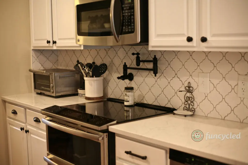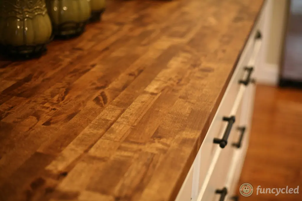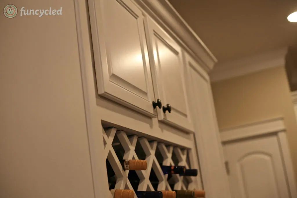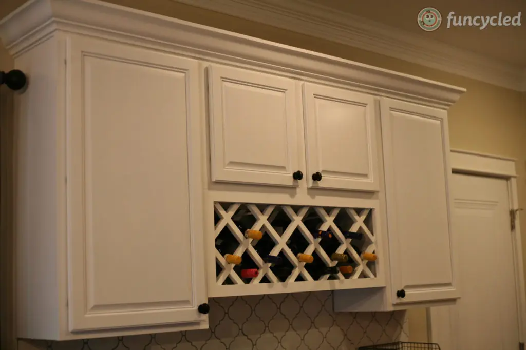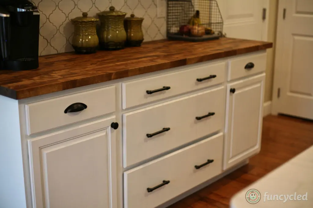 Christine had the tall section of the base cabinets brought lower and flush then extended the counter out a bit. She also had the counters replace. We added in the butcher block counter under the wine bar, the shiplap on the back side of the bar area, and installed the tile. In addition to painting the cabinets of course!