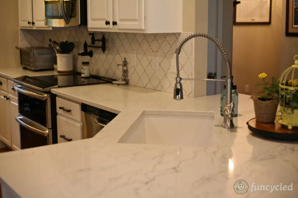 White Kitchen Cabinets with White Quartz and Butcher Block Counters