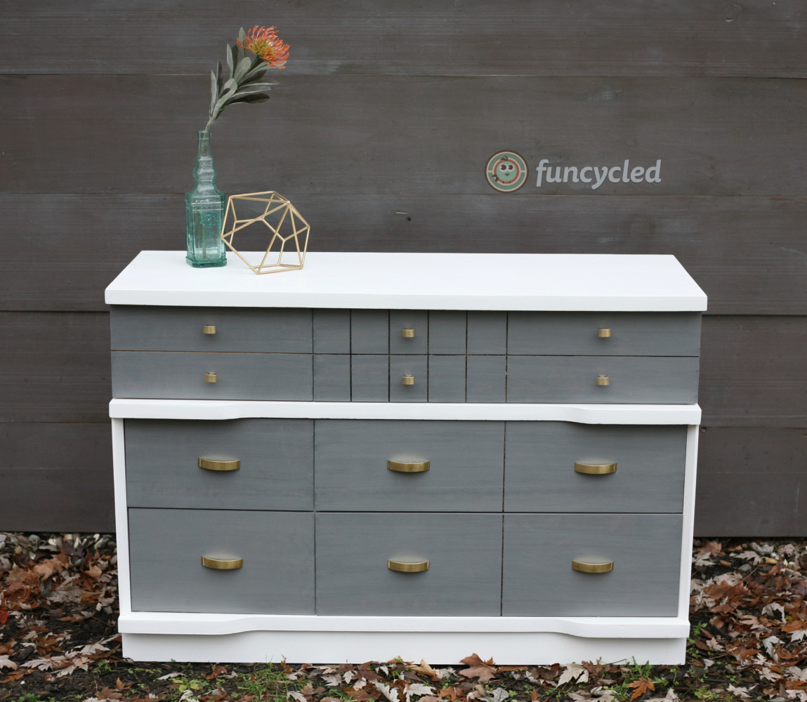 So we started with the tall oak dresser and added an ombre distressed finish. Look closely, we start with white and go down do a chalky black on the drawers, then heavily distressed everything. The outside of the dresser is painted with Benjamin Moore’s color Simply White. If you want to see how we paint furniture, check out our How to Paint Furniture post. Ready for the after?