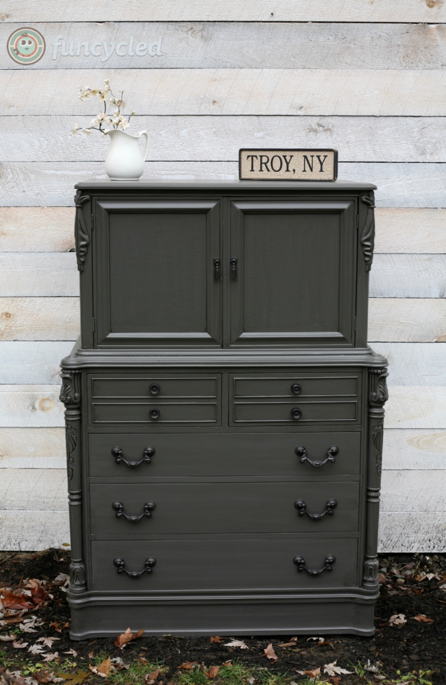 We painted it with Benjamin Moore’s color Urban Bronze, glazed it and then sprayed it with a protective clear coat. If you want to see how we paint furniture, check out our How to Paint Furniture post.