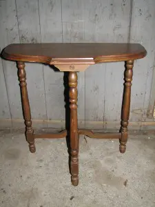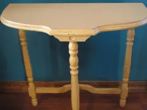Our good friend, Jo Ann,  (you will probably hear her name mentioned quite a bit) had this little hall table that was her grandmothers. It had a crack on one side and she wanted that fixed, to have us paint it a yellow color (we are all still debating on what color this actually is… lol), and then have us sand the edges to keep the antique look to the piece. Here’s our set by stop how to on refacing it.