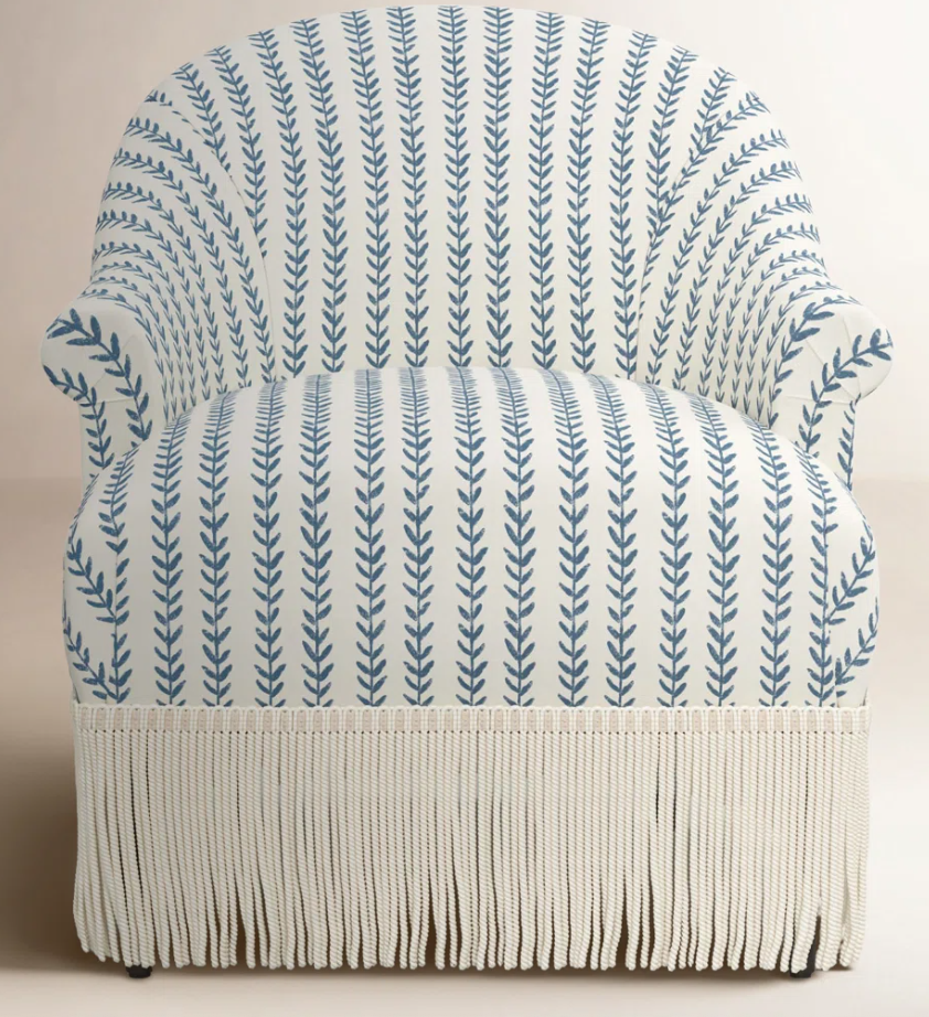 2026 is the year of the tactile home. We are seeing a major focus on details, specifically with upholstery. In the year ahead, we will see a more luxurious approach to furniture. For example, an upholstered chair becomes elevated with the added bullion fringe.
