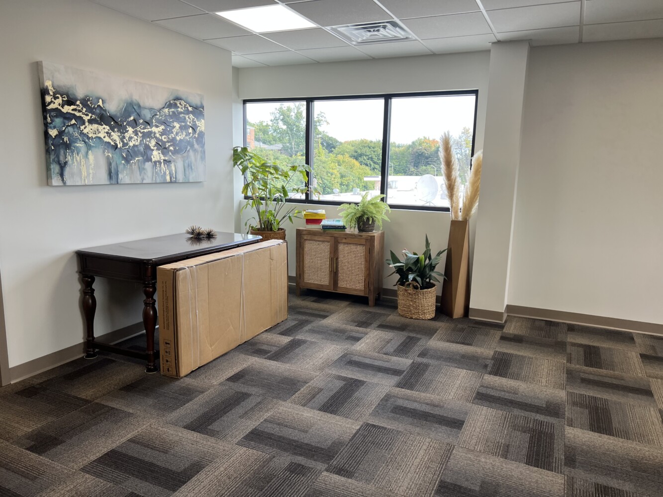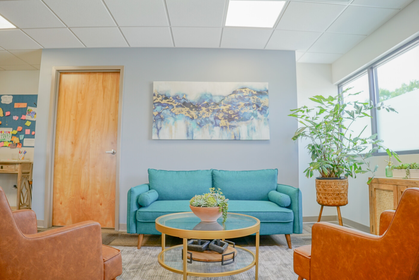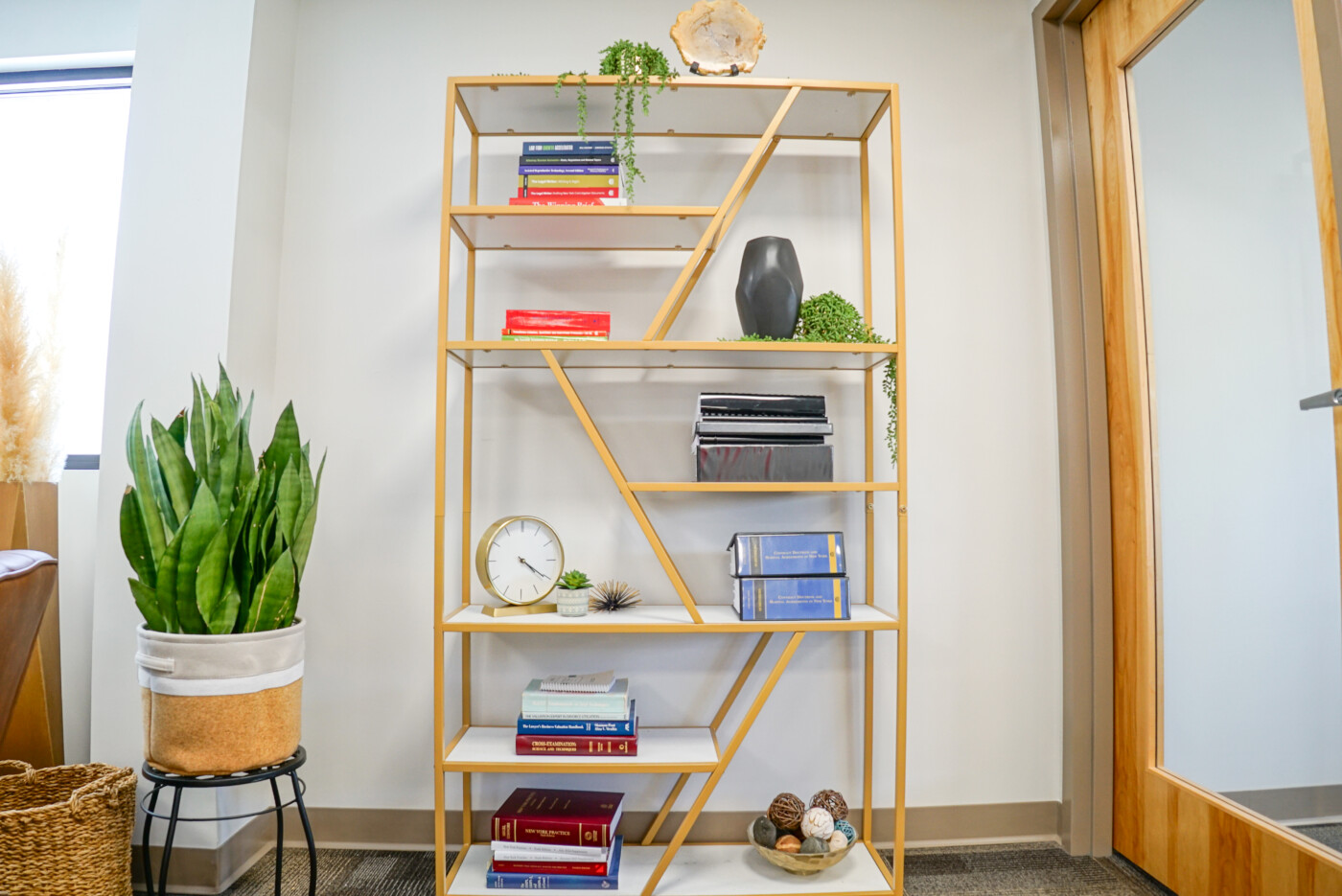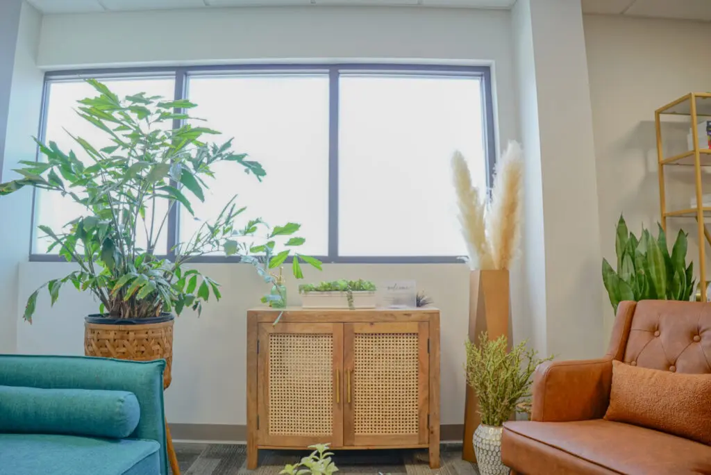 - Books, plants, and useful client materials live side by side