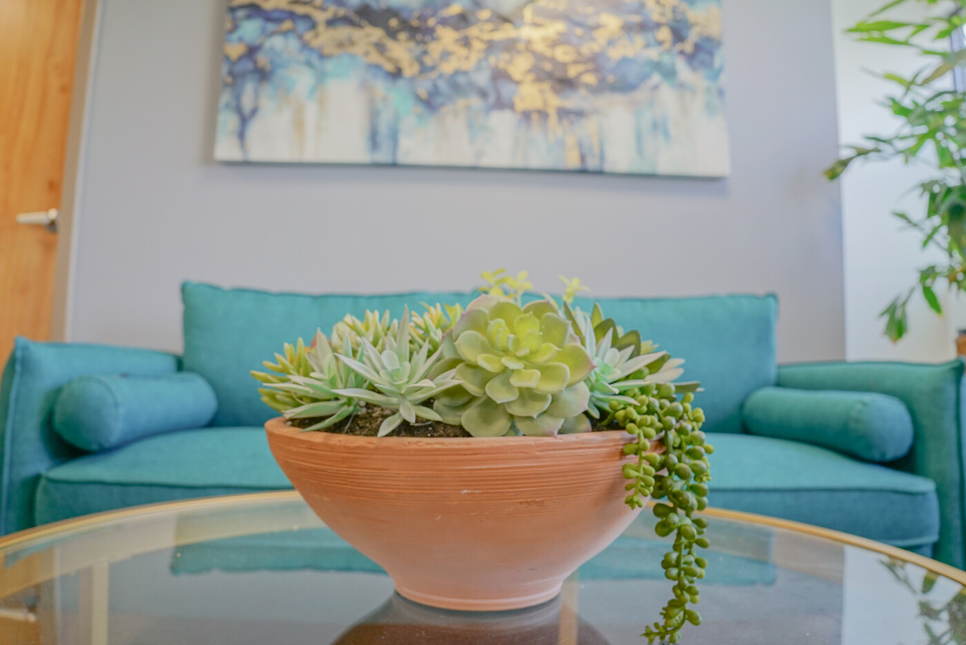 Choosing the right colors for the client lounge was key to striking the perfect balance between personality and professionalism. A bold teal sofa with clean lines added just the right amount of character without compromising the refined tone of the office. Gold and glass elements were used throughout the space to reflect light and elevate the design, offering a sense of polish without adding visual weight to what is a relatively compact area. Teal and gold together create a color palette that signifies trust, creativity, and stability which are three core values that shape strong client-attorney relationships. These colors weren’t limited to just this space either; they were thoughtfully carried throughout the entire office to create a cohesive and intentional design plan.