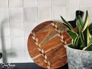 And below is a go-to for me when I am styling a counter or shelf in the kitchen. Grab a beautifully patterned cutting board, turn it on its side, and add a plant (say some herbs) in front. It’s lovely and practical!
