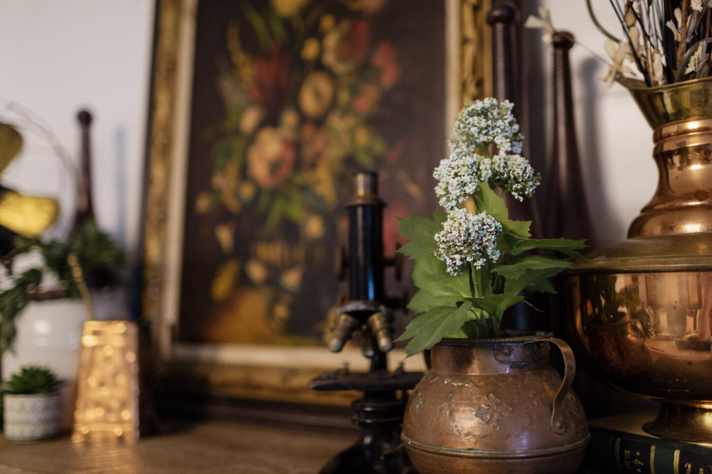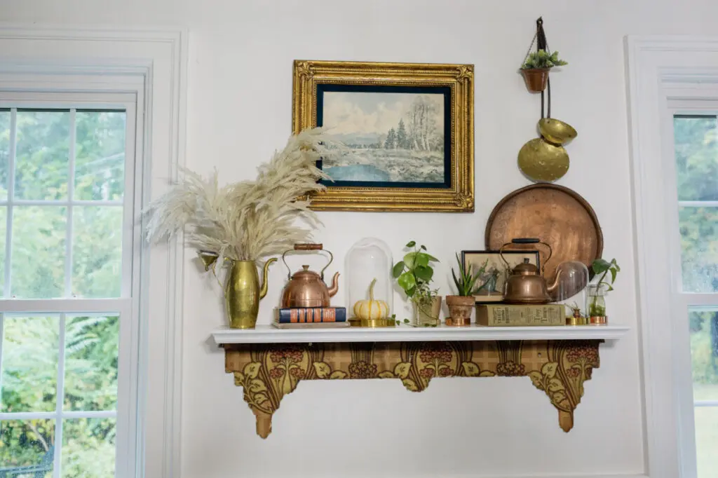 I love vintage copper and brass, and I like to add them into my decor throughout my house. Sometimes, this looks like a collection clustered together and displayed on a shelf.