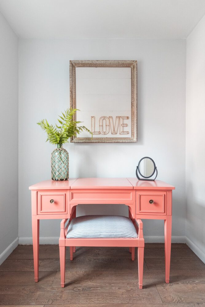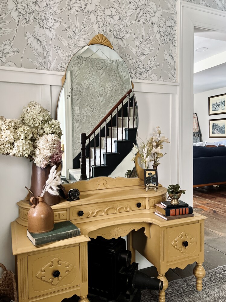 Consider repurposing an old dresser (or as in my case, vanity) and having it right at your entrance. The rich color offers an invitation of joy to guests while providing some needed quick storage solutions and place to tuck keys, hats, or gloves.