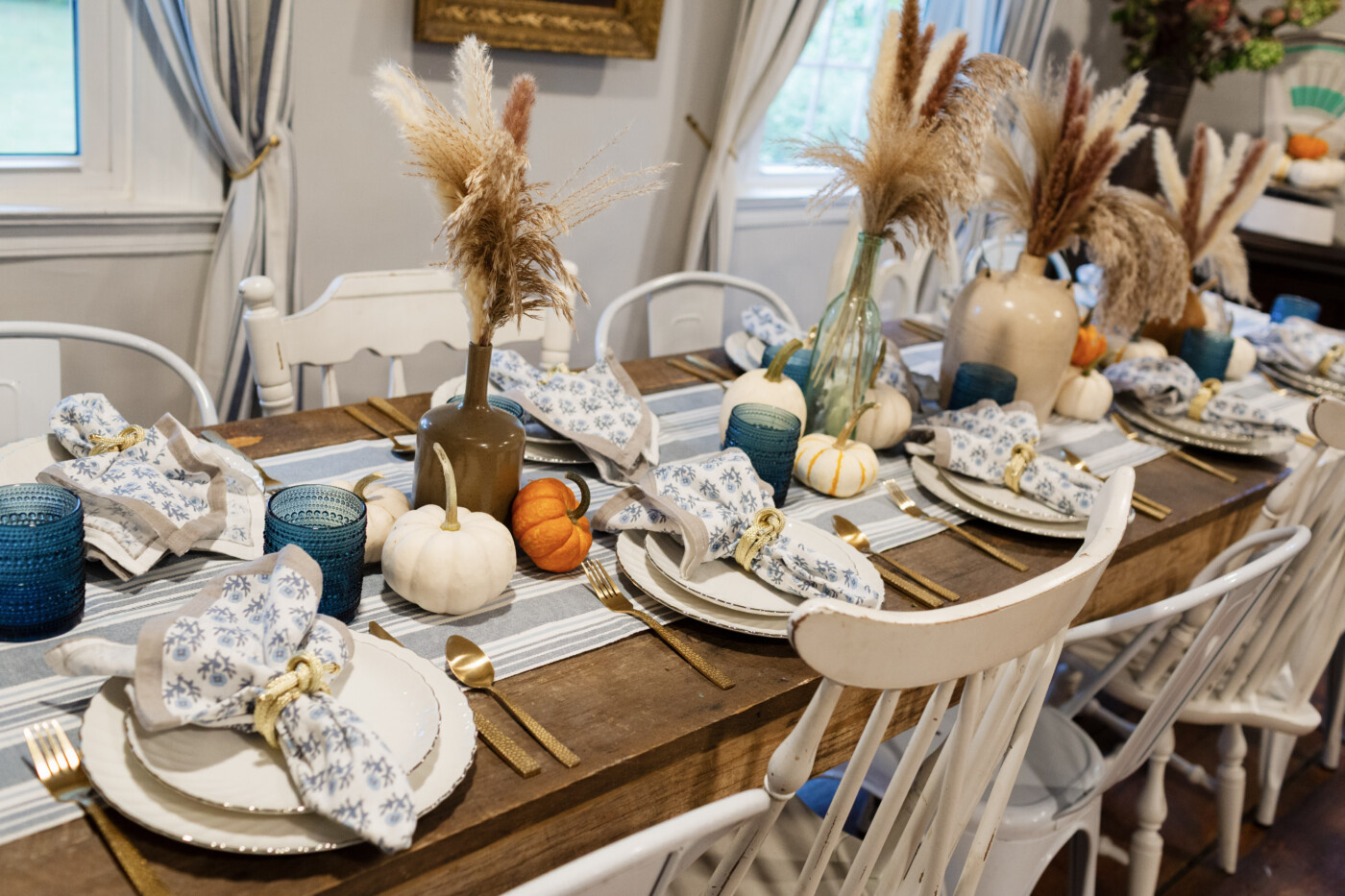 By blending repurposed items with modern elements, you create interiors that feel layered, collected over time, and deeply personal. Even small details, like distributing standout vintage crocks and ceramics across a table or using a simple runner to ground a mix-and-match setting, showcase intentionality and style. Situating fresh, updated patterns, like the one found in these napkins, along every table setting work to unify the mix of old and new working together.