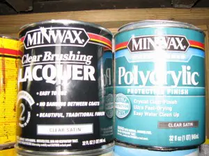 The guy at Home  Depot recommended that I try Minwax Lacquer instead. Here’s what that looks like next to the polycrylic that I bought to replace the gallon that I believed to be bad.