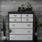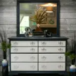 We refinished the top to its original glory and we painted the base a light gray. If you want to see how we paint furniture, check out our How to Paint Furniture post. After we painted it, we lightly glazed it, and sprayed a protective clear coat over the top.