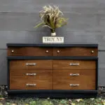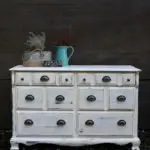 We painted it with Benjamin Moore’s color Simply White, medium distressed it, and sealed it with a protective clear coat. We also darkened the drawer fronts so they didn’t have as much of an orange hue. If you want to see how we paint furniture, check out our How to Paint Furniture post. Ready for the after?