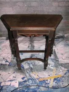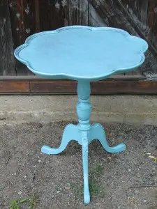 This antique pie shape table was painted teal, glazed using a chocolate coffee color and lightly distressed.