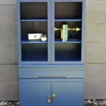 We took the doors off and replaced them with custom built rough cut wood. I also wanted to add more masculine hardware so I went with leather strap pulls. Then the buffet was painted with Benjamin Moore’s color Simply White, lightly distressed, and finished with a satin protective clear coat. If you want to see how we paint furniture, check out our How to Paint Furniture post.