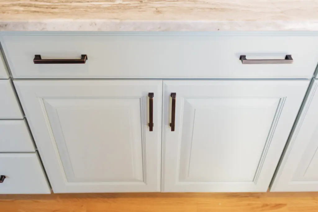 Painting Cabinets in Benjamin Moore Feather Down and Stratton Blue