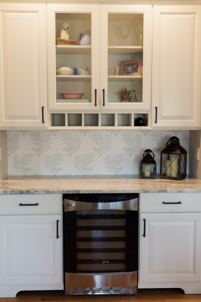 The bar area underwent the most dramatic change of all. Originally a dark espresso, we painted these cabinets in Feather Down to match the kitchen and ensure a cohesive look. We swapped the dated, dark countertops for a crisp, light quartz that reflects the light beautifully. To add a punch of personality, we installed a decorative blue wallpaper between the upper and lower cabinets. This serves as a stunning backsplash that ties the kitchen’s blue accents directly into the bar’s design.