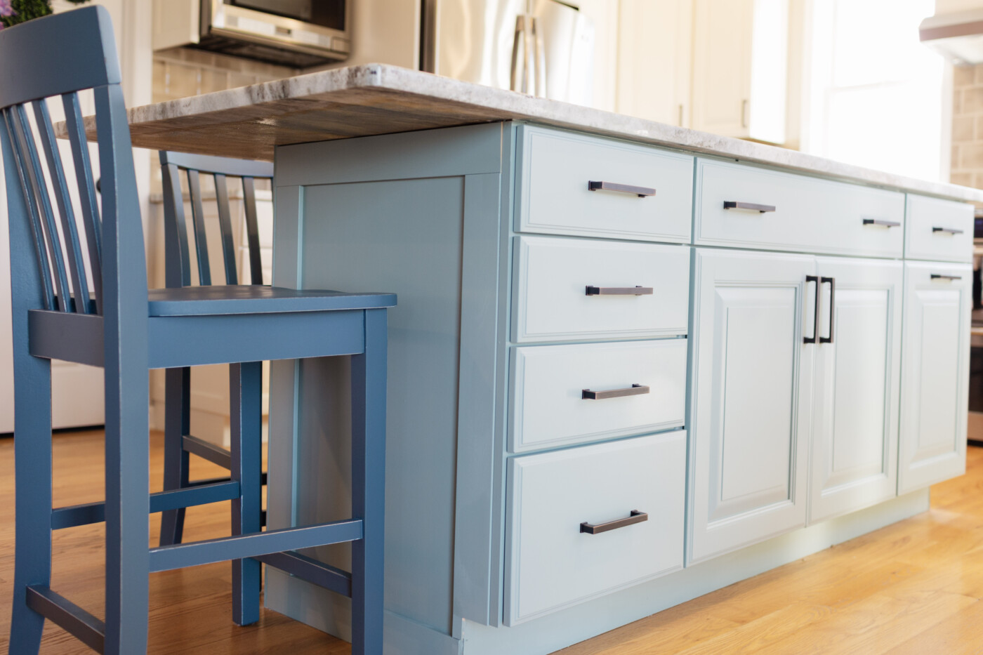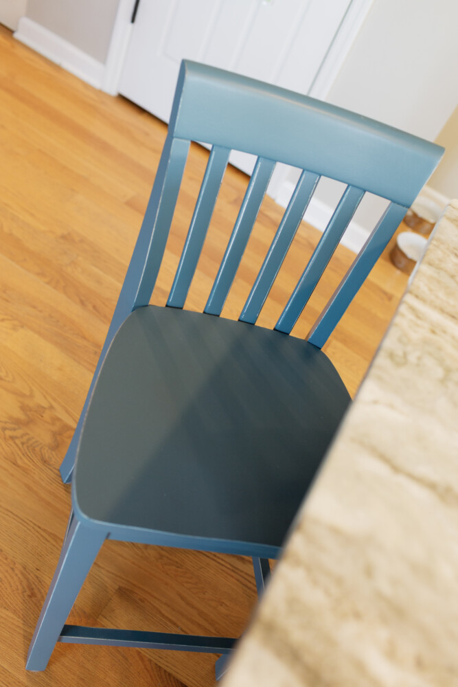 To round out the seating area, we refreshed the bar stools with Benjamin Moore Newburg Green. Don’t let the name fool you, however. This color reads as a stunning, deep teal-blue in most lights. By using this moodier shade on the stools, we added depth to the room without clashing with the softer Stratton Blue on the island. It’s a great example of how using different tones of the same color family can make a room feel curated rather than “matchy-matchy.”