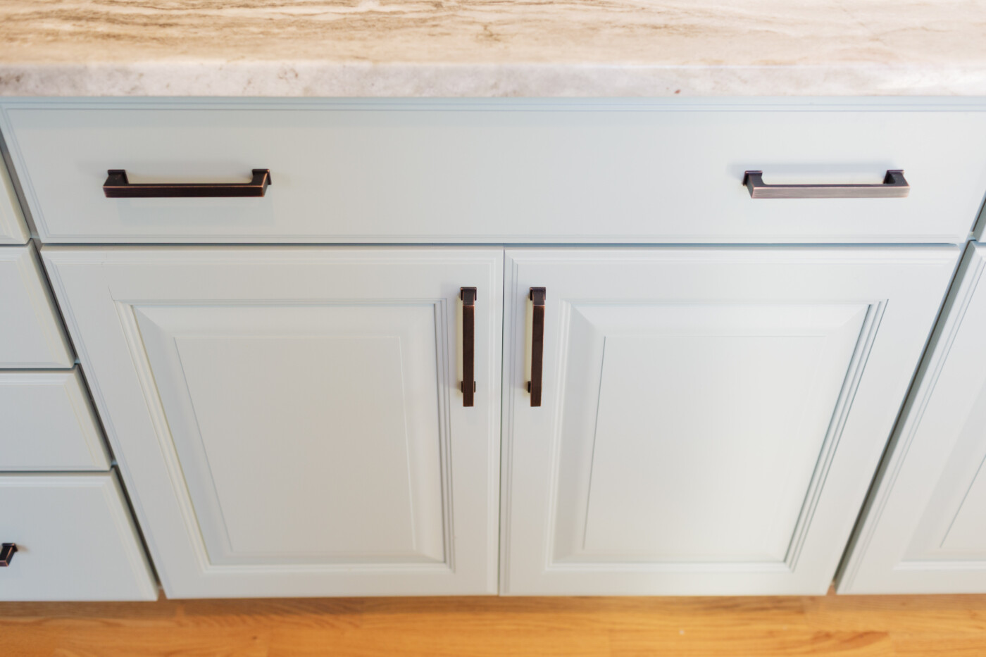 It’s a little hard to tell but this is a close up of the kitchen island, painted in the cool blue/green hue, Stratton Blue. Against the dark handles the blue really pops.