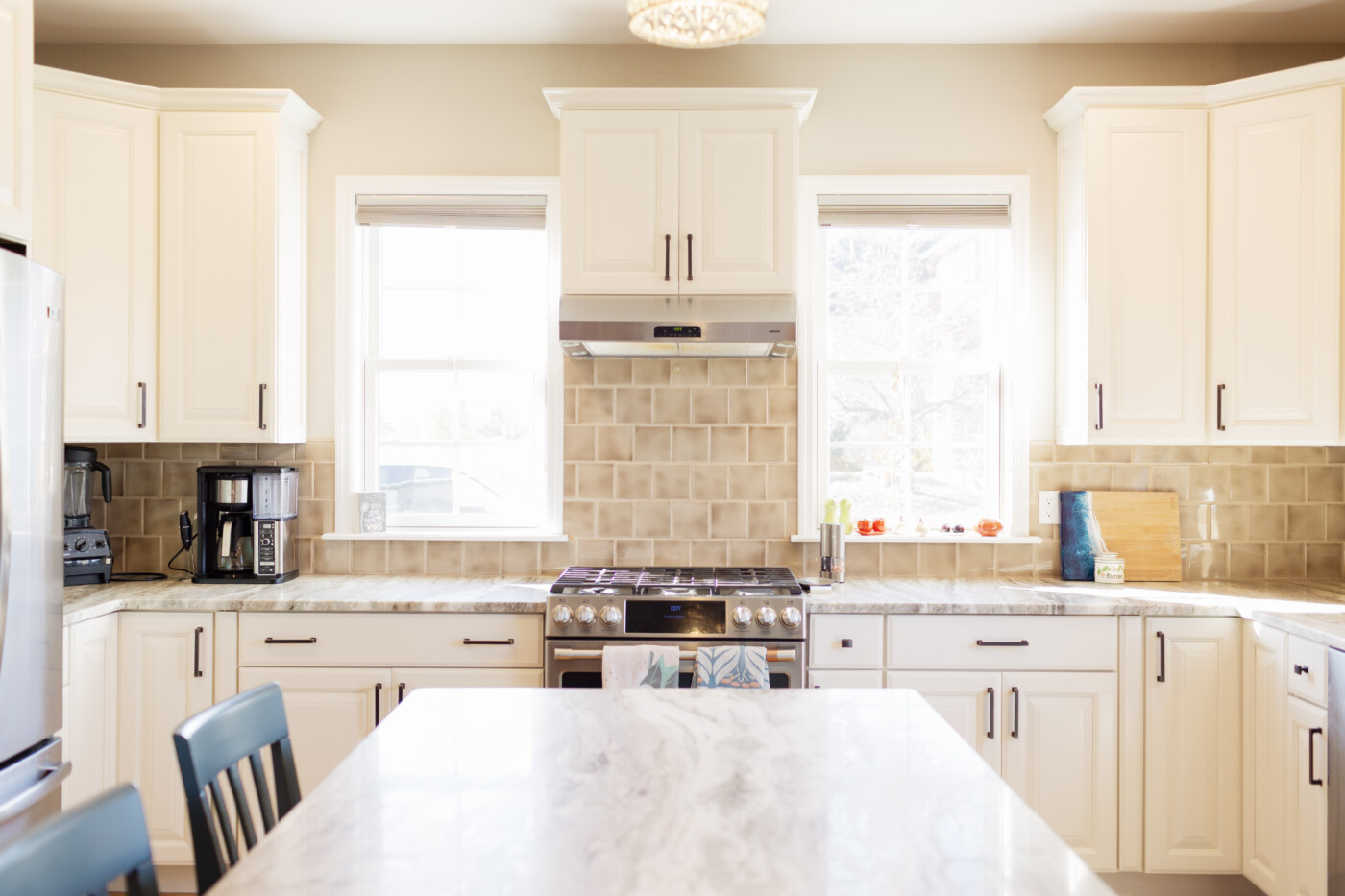With updated details on the cabinets, we were able to really hone in on the color palette, which is actually the genius behind this beautiful makeover! For the perimeter cabinets, we chose Benjamin Moore Feather Down. It is the perfect light beige, warm enough to feel cozy but light enough to keep the kitchen feeling expansive. For a bold focal point, we painted the island in Benjamin Moore Stratton Blue. This soft, coastal blue-green provides the perfect amount of contrast against the beige cabinetry, making the island feel like a piece of custom furniture rather than just a workspace.