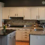 We painted the box Simply White by Benjamin More, added hardware (which it so badly needed), attached chrome legs, and made the herringbone pattern on the doors the focal point by staining it with a gray stain; which I LOVE! If you want to see how we paint furniture, check out our How to Paint Furniture post.