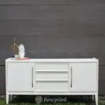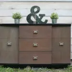 The hardware had to go and we wanted this piece to have a feminine design. We painted it with Benjamin Moore’s color Venetian Rose, distressed it, and finished with a satin protective clear coat. If you want to see how we paint furniture, check out our How to Paint Furniture post.