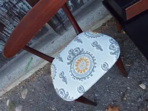 $85 – 50′s Chair with Yellow and Grey Upholstery | $75 – Retro Black End Stand with Drawer