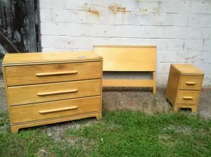 Hello All! Do you remember this boring old bedroom set on our Upcoming Projects page?? You don’t? I don’t see how you could have forgotten about it. ;) Well, my mom and I went to pick this set up and we somehow fit all three pieces, another headboard, and two more nightstands into my van WITH both of my kids. My mom is the miracle worker when it comes to packing lots of things into a small spot. I couldn’t believe it.
