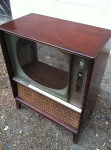 John built a shelf inside the TV and added a back to make it a small bookcase. We also had to order new knobs from ebay. I really wanted it keep its retro vibe so we attached new fabric on the front where the speaker is and painted it aqua. The fabric is from Hobby Lobby. If you’d like to see how we paint furniture, please check out our How to Paint Furniture post.
