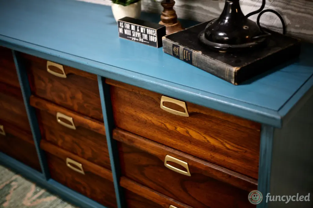 I loved the straight lines and handles on this piece. We went with Valspar’s color Vintage Teal for the box of this dresser. If you want to see how we paint furniture, check out our How to Paint Furniture post. After we painted it, glazed it, and sprayed a protective clear coat over the top.