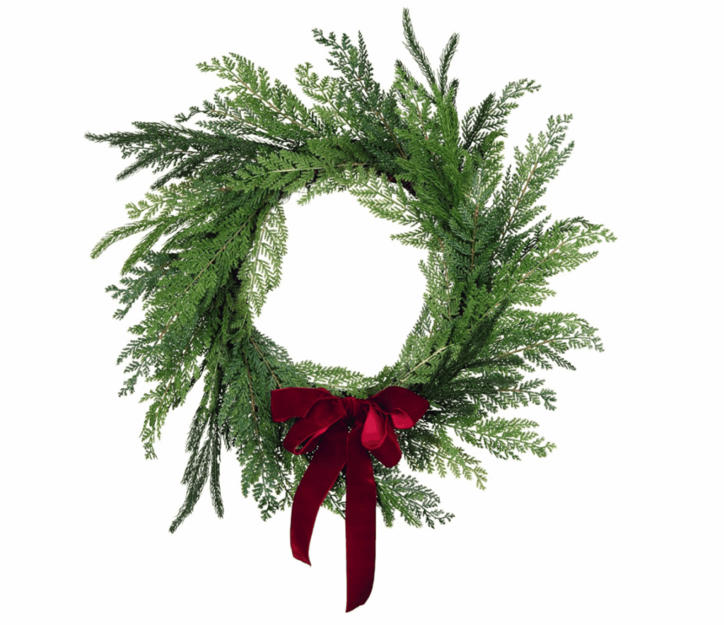 Begin with greens. Pines (any variety) work as a neutral and festive base that will support everything else. No matter the accents you choose, using pines will keep your decor grounded and timeless. Next layer in your colors, patterns, and texture. This year, I am using a mix of greens, dusty blues, and deep burgundy. It is nice play on traditional Christmas colors while pulling in some elements that align with popular motifs for Christmas 2025.