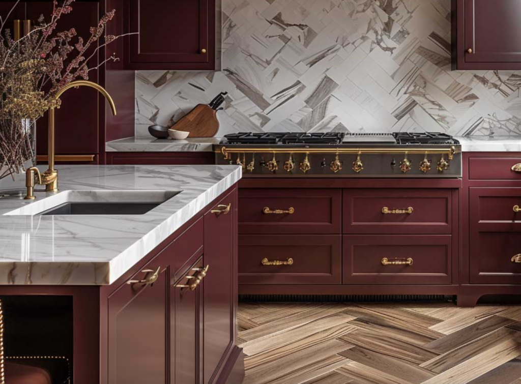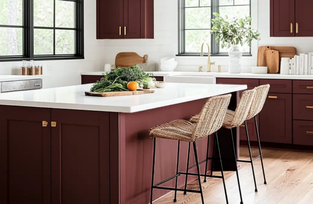 No matter how you slice it, this red is timeless and elegant when painted on kitchen cabinets and paired with brass or gold hardware. We love how rich each of these kitchen designs are, all outfitted in a deep burgundy inspired by this lovely hue!