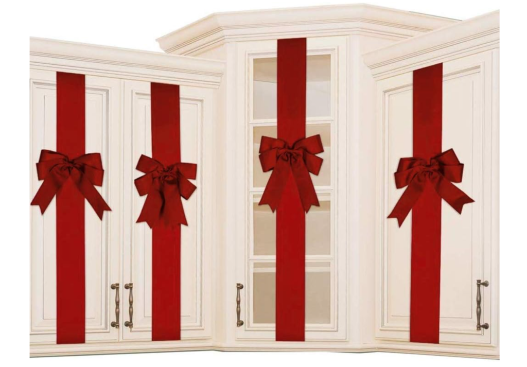 Ribbons aren’t just showing up as Christmas garland. We are seeing ribbons tied to Christmas trees – ornament style, donning tops of trees, being placed on vases and everyday decor items, and embellishing kitchen cabinet doors. Here are some options you could consider for your own home.