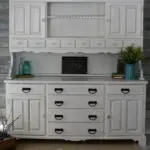 We painted the kitchen cabinets with Benjamin Moore’s Advanced paint in Navajo White. We also sprayed it with a water based clear coat for extra protection and durability.